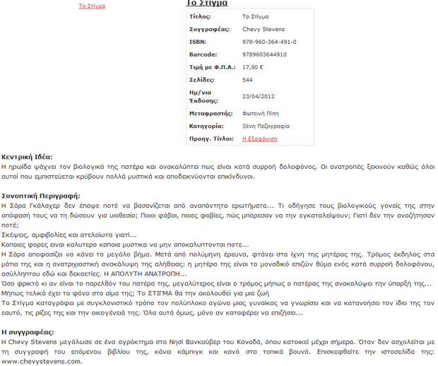 Τέλος, η Chevy Stevens μετά το βιβλίο «Η Εξαφάνιση» επιστρέφει με «Το Στίγμα» πιο ανατρεπτικό και με σασπένς. Ένα καλοδουλεμένο αστυνομικό θρίλερ από αυτά που δεν αφήνεις από τα χέρια σου. «Το Στίγμα» θα σας καθηλώσει με την επιθυμία να διαβάσετε κάθε σελίδα του με τις απρόβλεπτες ανατροπές του και θα γνωρίσετε και το τελευταίο μυστικό μεταξύ μιας γυναίκας και του κατά συρροή δολοφόνου πατέρα της.