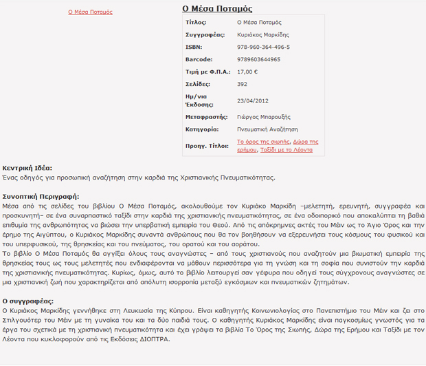 Ο πολυδιαβασμένος Κυριάκος Μαρκίδης μας οδηγεί σε ένα προσκύνημα στην καρδιά της χριστιανικής πνευματικότητας. Όπως και στα προηγούμενα έργα του, «Το Όρος της Σιωπής», «Τα Δώρα της Ερήμου», «Ταξίδι με τον Λέοντα», έτσι και στο νέο του βιβλίο «Ο Μέσα Ποταμός», ο συγγραφέας επιχειρεί μια εμβάπτιση στο ποτάμι του χριστιανισμού, δίνοντας έμφαση στις διδαχές του πνευματικού του, του Πατέρα Μάξιμου, καθώς και στη μυστικιστική πτυχή της Εκκλησίας. Ο Κυριάκος Μαρκίδης μέσα από το βιβλίο του εφιστά την προσοχή στην ύπαρξη μιας αρχαίας μορφής μυστικισμού, εντός των ορίων του σύγχρονου Χριστιανισμού.