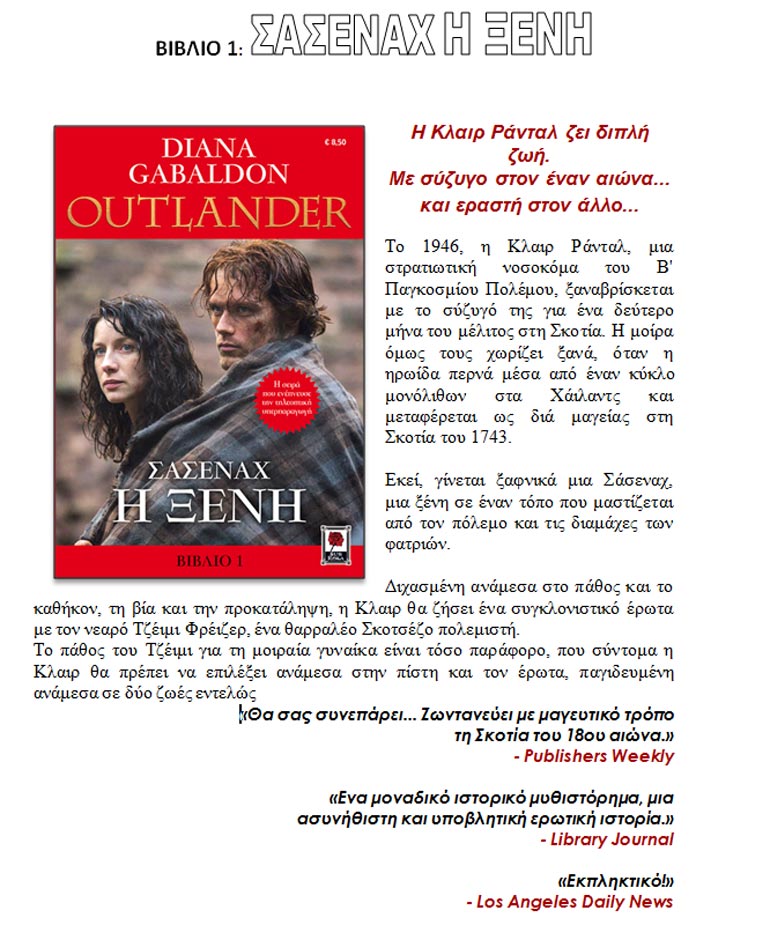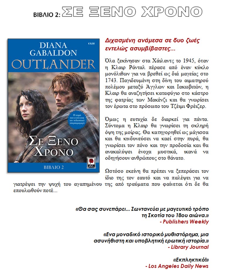 Η σειρά Outlander, το εκδοτικό φαινόμενο της Diana Gabaldon, έκλεψε τις καρδιές του αναγνωστικού κοινού, μεταφράστηκε σε περισσότερες από 10 γλώσσες, κατέκτησε τις σημαντικότερες λίστες best-sellers παγκοσμίως και ενέπνευσε την ομότιτλη τηλεοπτική υπερπαραγωγή!