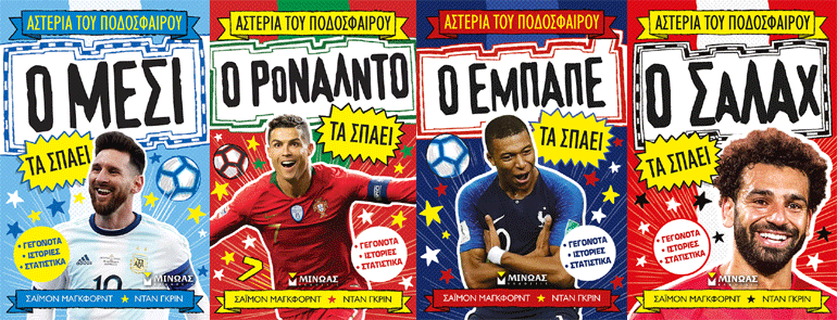 Ο Λίο Μέσι, ο Κριστιάνο Ρονάλντο, ο Κιλιάν Εμπαπέ και ο Μο Σαλάχ παίζουν μπάλα στις εκδόσεις Μίνωας. Πρόκειται για τέσσερα παιδικά βιβλία που με τη μορφή κόμικς συστήνουν στους μικρούς φίλους του ποδοσφαίρου τέσσερις από τους πιο σπουδαίους εν ενεργεία ποδοσφαιριστές.