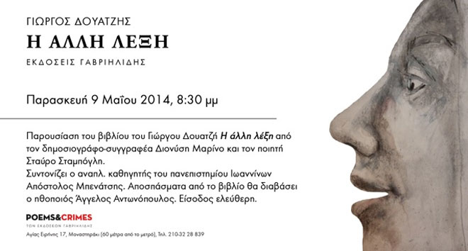 Αύριο, Παρασκευή 9 Μαΐου στις 20:30 γίνεται η παρουσίαση του βιβλίου του Γιώργου Δουατζή με τίτλο «Η ΑΛΛΗ ΛΕΞΗ»στις Εκδόσεις Γαβριηλίδης, Αγίας Ειρήνης 17, Μοναστηράκι (60 μέτρα από το μετρό).