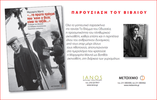 Ο IANOS και οι εκδόσεις ΜΕΤΑΙΧΜΙΟ σας προσκαλούν στην παρουσίαση του βιβλίου της Μαργαρίτας Μαντά «…ΤΟ ΠΡΩΤΟ ΠΡΑΓΜΑ ΠΟΥ ‘ΚΑΝΕ Ο ΘΕΟΣ ΕΙΝΑΙ ΤΟ ΤΑΞΙΔΙ…» Το βλέμμα του Οδυσσέα του Θόδωρου Αγγελόπουλου Ημερολόγιο Γυρισμάτων, την Πέμπτη, 28 Φεβρουαρίου 2013, στις 8 μ.μ.,