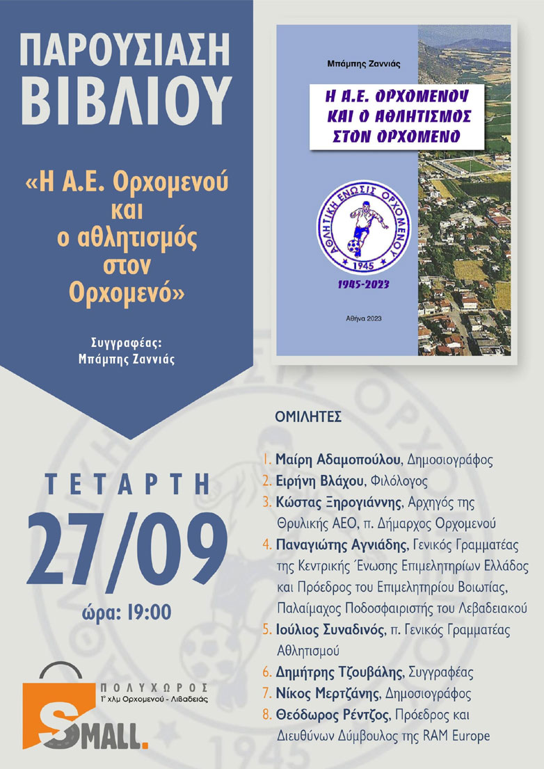 Το 4ο βιβλίο του θα παρουσιάσει στον Ορχομενό στις 27 Σεπτεμβρίου ημέρα Τετάρτη στις 19:00 στον πολυχώρο Small ο Ορχομένιος δημοσιογράφος Μπάμπης Ζαννιάς.
