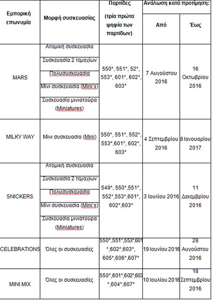 Με βάση τη σχετική γνωστοποίηση, στην Κύπρο έχουν κυκλοφορήσει από τον επίσημο αντιπρόσωπο μόνο οι εμπορικές επωνυμίες MARS και SNICKERS.