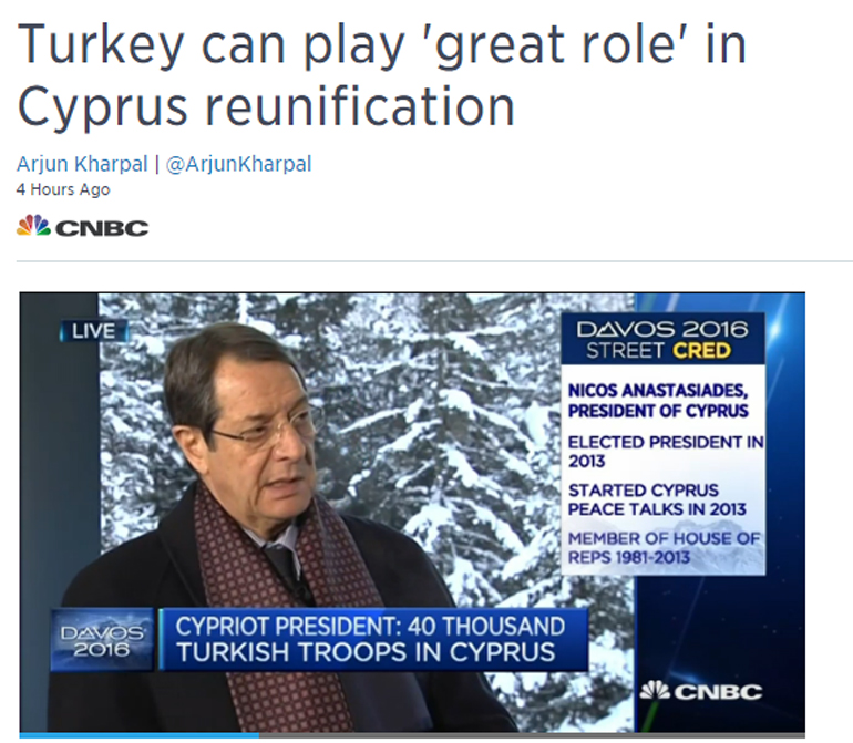 Μιλώντας στο Νταβός, ο Πρόεδρος Αναστασιάδης είπε ότι «όλοι συνειδητοποιούν ότι όσο πιο σύντομα φτάσουμε σε μια συμφωνία, τόσο πιο δίκαιη θα είναι για όλους». Η επίλυση του προβλήματος «δεν είναι μόνο θέμα της Κύπρου», ανέφερε ο Πρόεδρος Αναστασιάδης. «Πρέπει να έχετε κατά νου ότι στην Κύπρο υπάρχουν ακόμη 40 χιλιάδες Τούρκοι στρατιώτες, οπότε η Τουρκία μπορεί να διαδραματίσει σημαντικό ρόλο», είπε.