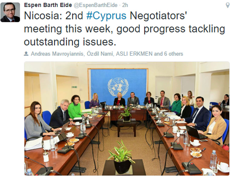 Πρόοδος σημειώνεται σήμερα στη δεύτερη συνάντηση των διαπραγματευτών αυτήν την εβδομάδα, αναφέρει σε ανάρτησή του στο Τwitter ο ειδικός σύμβουλος του γ.γ. του ΟΗΕ για το Κυπριακό, Έσπεν Μπαρθ Έιντε.