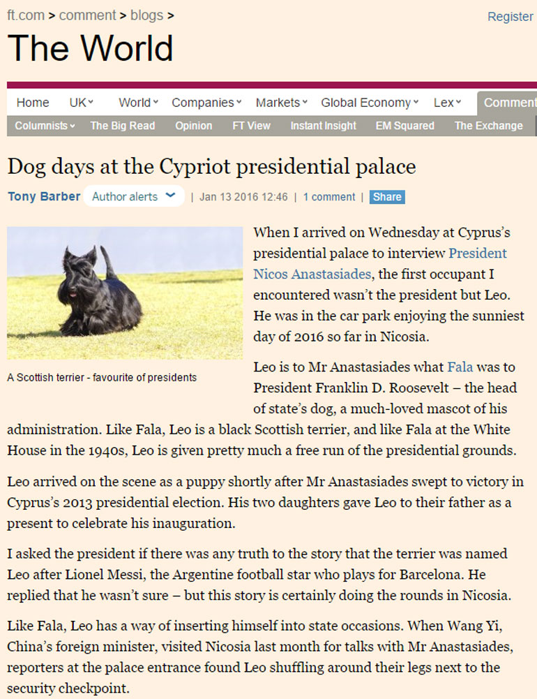 Αφιέρωμα στον πιστό φίλο του Προέδρου της Κυπριακής Δημοκρατίας, στον τετράποδο Λίο, που «έφυγε» την Τρίτη από ανακοπή, είχε κάνει ο δημοσιογράφος των Financial Times, Tony Barber.