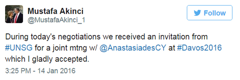 Με ανάρτηση του επίσης στο twitter, ο κ. Ακιντζί έγραψε ότι η πρόσκληση απευθύνθηκε από τον ΓΓ του ΟΗΕ κατά τη σημερινή συνάντηση, στο πλαίσιο των διαπραγματεύσεων, την οποία, όπως γράφει, αποδέχθηκε με χαρά.