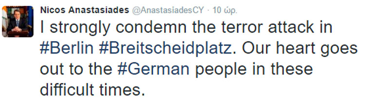 Σε ανάρτηση στον λογαριασμό του στο Τwitter, ο κ. Αναστασιάδης έγραψε στα αγγλικά πως καταδικάζει έντονα την τρομοκρατική επίθεση στο Breitscheidplatz, στο Βερολίνο. Η καρδιά μας, πρόσθεσε, βρίσκεται μαζί με τον γερμανικό λαό σε αυτές τις δύσκολες στιγμές.