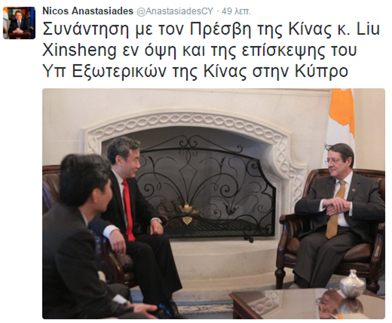 Σε ανάρτηση στο λογαριασμό του στο Twitter, ο Πρόεδρος Αναστασιάδης ανέφερε πως η συνάντηση πραγματοποιήθηκε ενόψει και της επικείμενης επίσκεψης στην Κύπρο του Υπουργού Εξωτερικών της Κίνας Wang Yi.