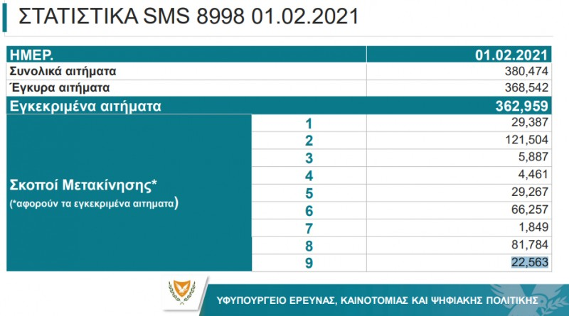 Τα στατιστικά στοιχεία σχετικά με τα μηνύματα που στάλθηκαν από πολίτες στο 8998 για κατ΄ εξαίρεση μετακίνηση έδωσε στη δημοσιότητα το Υφυπουργείο Έρευνας και Καινοτομίας της Κύπρου.