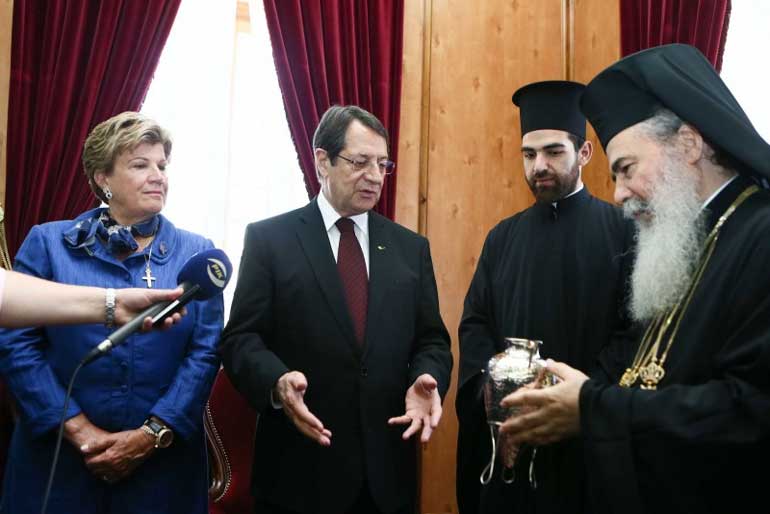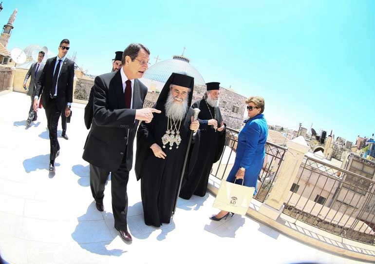 Ο πρόεδρος της Κυπριακής Δημοκρατίας, Νίκος Αναστασιάδης, συνοδευόμενος από τη σύζυγο του Άντρη, επισκέφθηκε την Κυριακή το Πατριαρχείο Ιεροσολύμων, όπου τον υποδέχθηκε ο Πατριάρχης Ιεροσολύμων Θεόφιλος Γ’.