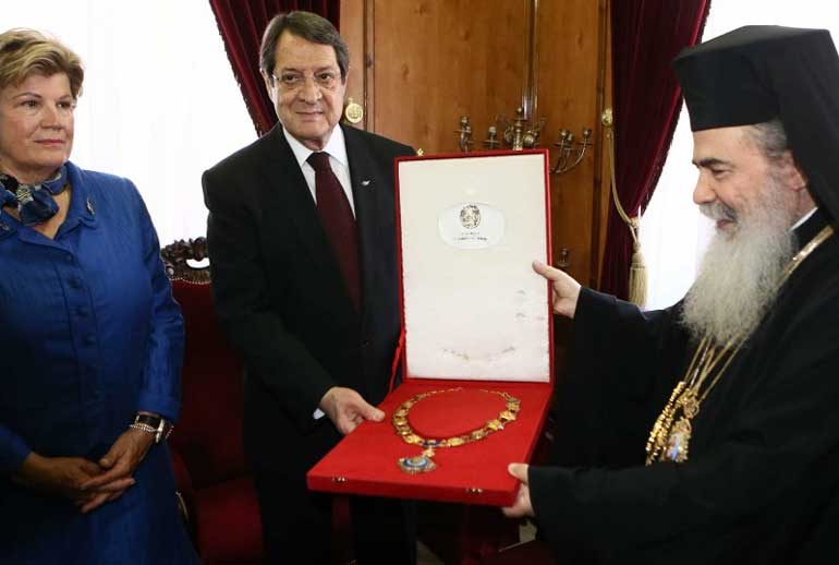 Ο Πατριάρχης τίμησε τον Πρόεδρο της Δημοκρατίας με το Ανώτατο Παράσημο του Παναγίου Τάφου και του δώρισε μια εικόνα του Αγίου Νικολάου, ενώ στην κα Αναστασιάδη δώρισε το Σταυρό του Παναγίου Τάφου.