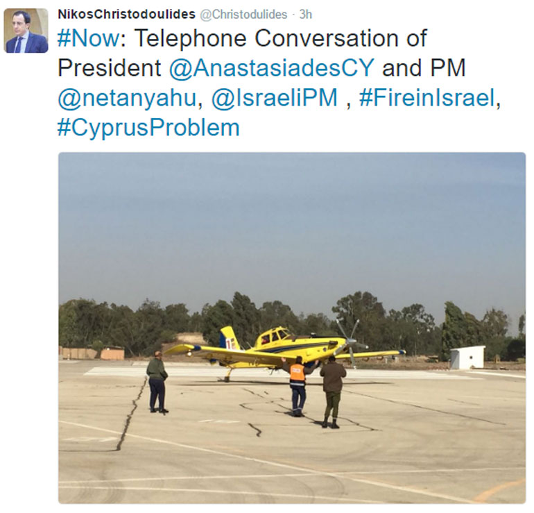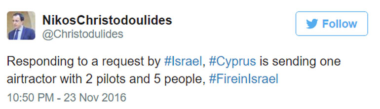 Σε ανάρτηση στον προσωπικό του λογαριασμό στο Twitter, ο κυβερνητικός εκπρόσωπος Νίκος Χριστοδουλίδης αναφέρει ότι υπήρξε τηλεφωνική συνομιλία του προέδρου Αναστασιάδη με τον πρωθυπουργό του Ισραήλ Μπενιαμίν Νετανιάχου για την αποστολή βοήθειας από την Κύπρο.