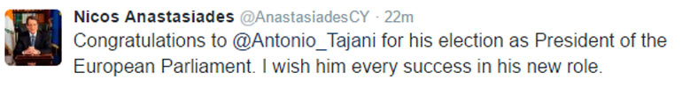Όπως αναφέρει στο tweet του ο κ. Αναστασιάδης: «Συγχαρητήρια στον Αντόνιο Ταγιάνι για την εκλογή του ως προέδρου του Ευρωπαϊκού Κοινοβουλίου. Του εύχομαι κάθε επιτυχία στον νέο του ρόλο».