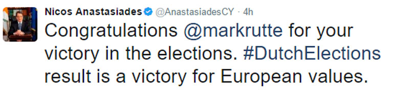 Συγχαρητήρια στον νικητή των βουλευτικών εκλογών της Ολλανδίας Μαρκ Ρούτε, έστειλε με ανάρτησή του στον προσωπικό του λογαριασμό στο twitter ο Πρόεδρος της Κυπριακής Δημοκρατίας Νίκος Αναστασιάδης.