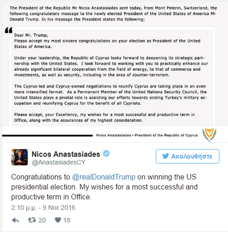 Συγχαρητήριο μήνυμα προς τον νεοεκλεγέντα πρόεδρο των ΗΠΑ Ντόναλντ Τραμπ απέστειλε ο πρόεδρος της Κυπριακής Δημοκρατίας Νίκος Αναστασιάδης από το Μοντ Πελεράν όπου βρίσκεται για τις συνομιλίες για το εδαφικό, υπογραμμίζοντας πως οι ΗΠΑ, ως μόνιμο μέλος του Σ.Α. των Ηνωμένων Εθνών παίζουν ζωτικό ρόλο στην υποβοήθηση των προσπαθειών προς τερματισμό της στρατιωτικής κατοχής από την Τουρκία και στην επανένωση της Κύπρου προς όφελος όλων των Κυπρίων.