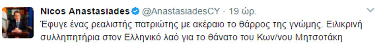 «Έφυγε ένας ρεαλιστής πατριώτης με ακέραιο το θάρρος της γνώμης. Ειλικρινή συλλυπητήρια στον ελληνικό λαό για το θάνατο του Κων/νου Μητσοτάκη» έγραψε ο κ. Αναστασιάδης στον προσωπικό του λογαριασμό στο Τwitter.