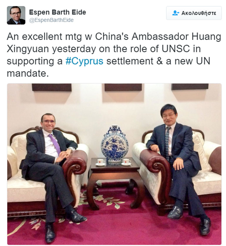 Σε ανάρτησή του στο Τwitter, o κ. Έιντε αναφέρεται σε μια «εξαιρετική συνάντηση με τον πρέσβη της Κίνας Huang Xingyuan χθες για τον ρόλο του ΣΑ των ΗΕ στην υποστήριξη μιας διευθέτησης στην Κύπρο και για μια νέα εντολή στα Ηνωμένα Έθνη».