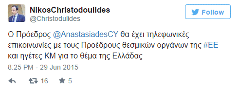 Τηλεφωνικές επικοινωνίες με τους προέδρους θεσμικών οργάνων της ΕΕ και ηγέτες κρατών- μελών για το θέμα της Ελλάδας θα έχει αύριο ο Πρόεδρος της Κυπριακής Δημοκρατίας Νίκος Αναστασιάδης.
