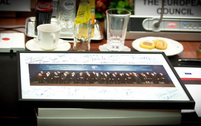 Η φωτογραφία είχε τυπωμένη στην ελληνική γλώσσα την ευχή «περαστικά σας, κ. Πρόεδρε» και ήταν υπογεγραμμένη από όλους τους ηγέτες της Ε.Ε.