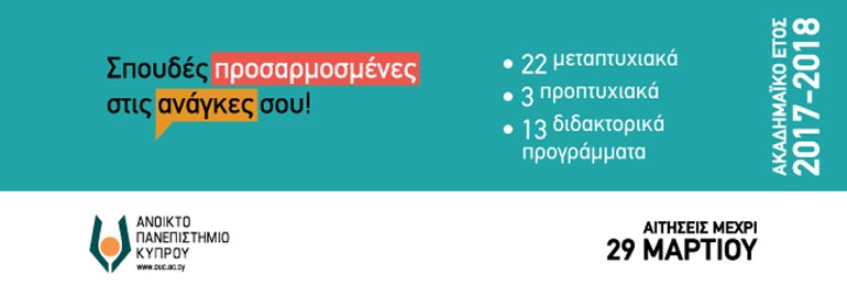 Με 22 μεταπτυχιακά, 3 προπτυχιακά προγράμματα σπουδών και δυνατότητες για διδακτορικές σπουδές σε 13 επιστημονικά πεδία, το Ανοικτό Πανεπιστήμιο Κύπρου (ΑΠΚΥ) ανακοινώνει την περίοδο υποβολής αιτήσεων για το ακαδημαϊκό έτος 2017-2018 με καταληκτική ημερομηνία την 29η Μαρτίου 2017.