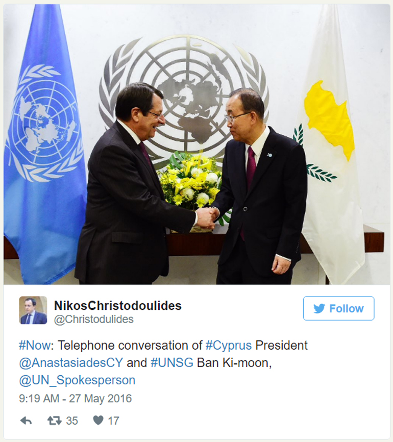 Τηλεφωνική επικοινωνία με τον πρόεδρο της Κυπριακής Δημοκρατίας Νίκο Αναστασιάδη είχε το πρωί της Παρασκευής ο γ.γ. των Ηνωμένων Εθνών Μπαν Κι-μουν, ανακοίνωσε o κυβερνητικός εκπρόσωπος Νίκος Χριστοδουλίδης, μέσω του λογαριασμού του στο Τwitter.