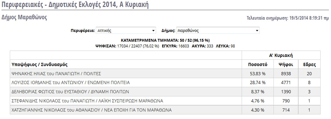 Ο Ηλίας Ψινάκης, δικαιώνοντας τις προβλέψεις, εξελέγη δήμαρχος Μαραθώνα από την πρώτη κιόλας Κυριακή των εκλογών.