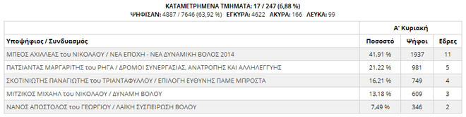 Σταθερή παραμένει η διαφορά υπέρ του Αχιλλέα Μπέου στον Δήμο Βόλου έναντι του δεύτερου Μαργαρίτη Πατσιαντά. Στην τρίτη θέση...