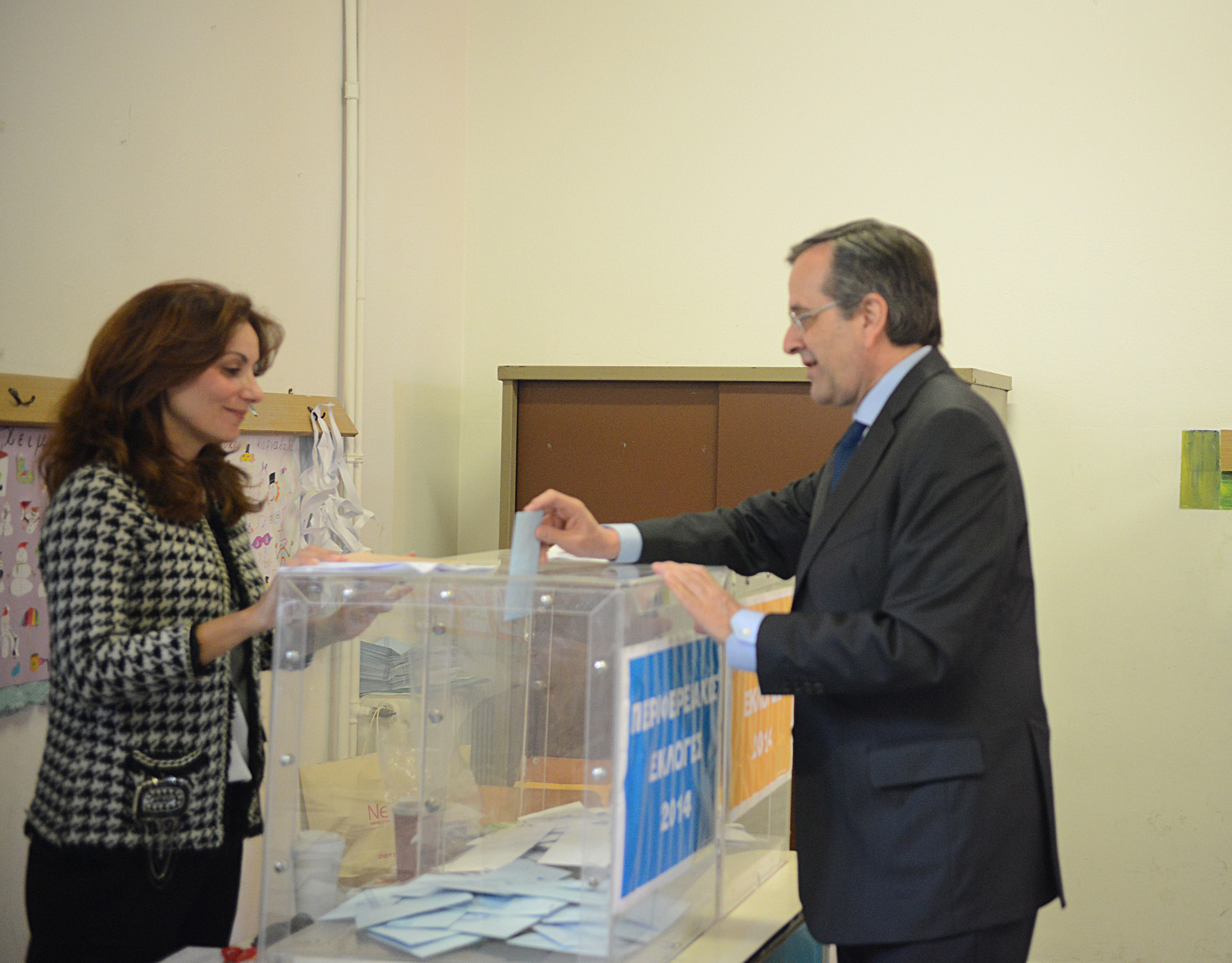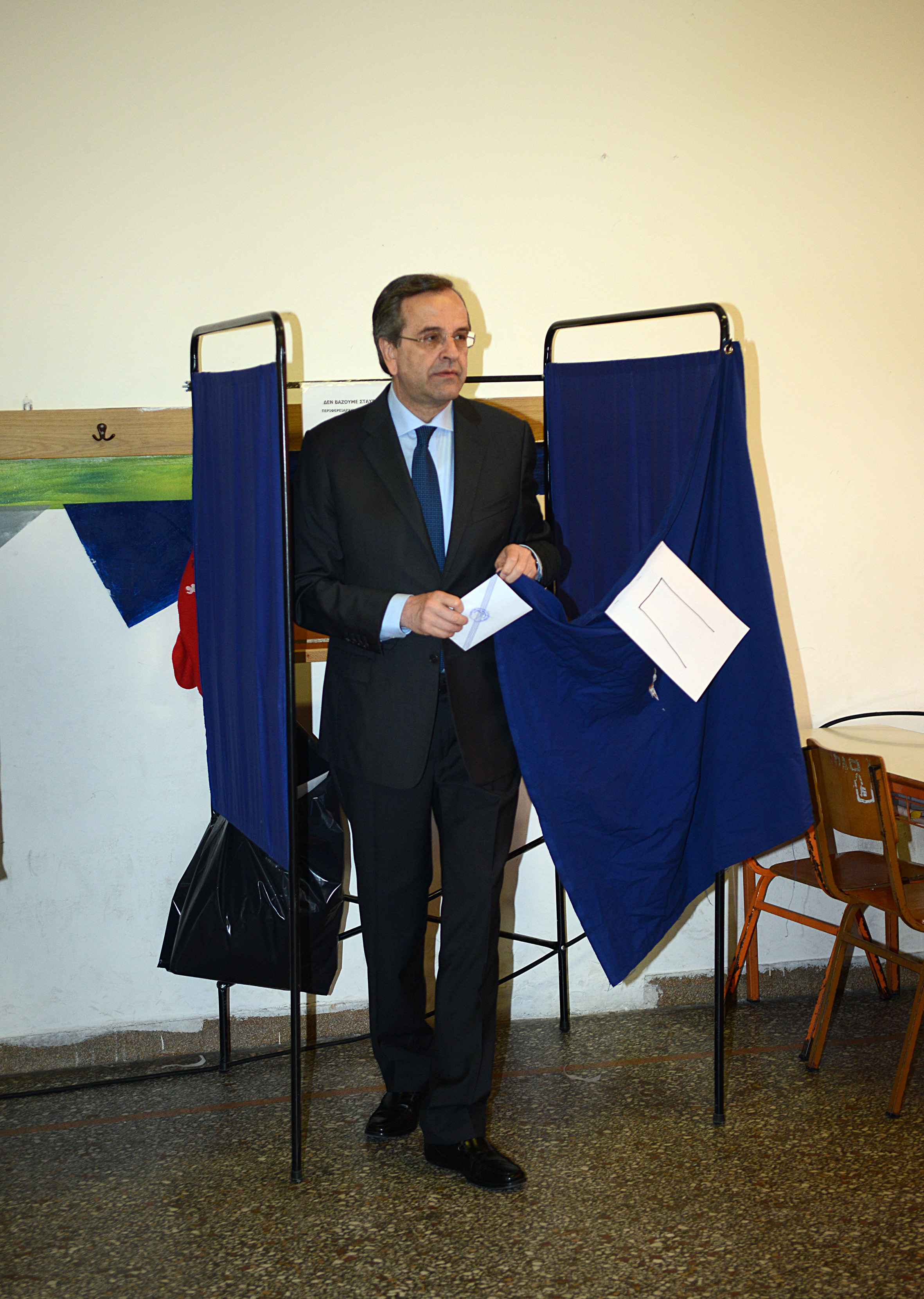 Ο κ. Σαμαράς ευδιάθετος, χαιρέτησε τα μέλη της εφορευτικής επιτροπής και άφησε τη σύζυγό του να ψηφίσει πρώτη.