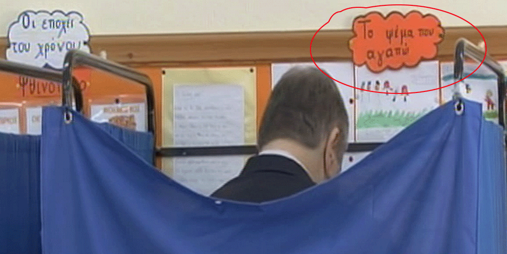 Το μήνυμα πάνω από το παραβάν μέσα στο οποίο ψήφισε ο Βενιζέλος
