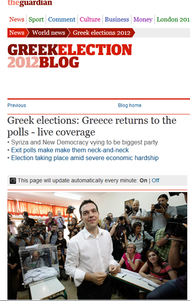Ο βρετανικός «Guardian» παραπέμπει από την πρώτη του σελίδα τους επισκέπτες του να παρακολουθήσουν τη συνεχή και λεπτό προς λεπτό ανταπόκρισή του για τις ελληνικές εκλογές. Πρώτος τίτλος του ρεπορτάζ του: «Στήθος με στήθος τα δύο πρώτα κόμματα», με κεντρική φωτογραφία τον Αλέξη Τσίπρα από το εκλογικό κέντρο όπου ψήφισε.