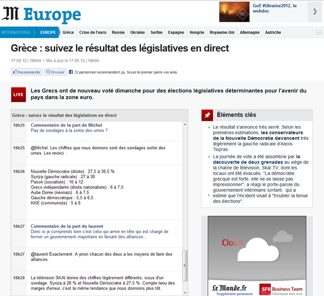 Η γαλλική «Le Monde» έχει δεύτερο θέμα, μετά τον δεύτερο γύρο των γαλλικών βουλευτικών εκλογών, τις ελληνικές εκλογές, τα αποτελέσματα των οποίων καλύπτει με συνεχή ενημέρωση λεπτό προς λεπτό. Μετέδωσε το πρώτο exit poll, χαρακτηρίζοντας το κόμμα των Ανεξάρτητων Ελλήνων ως «Δεξιούς Εθνικιστές» και τη Χρυσή Αυγή ως «Νεοναζί».