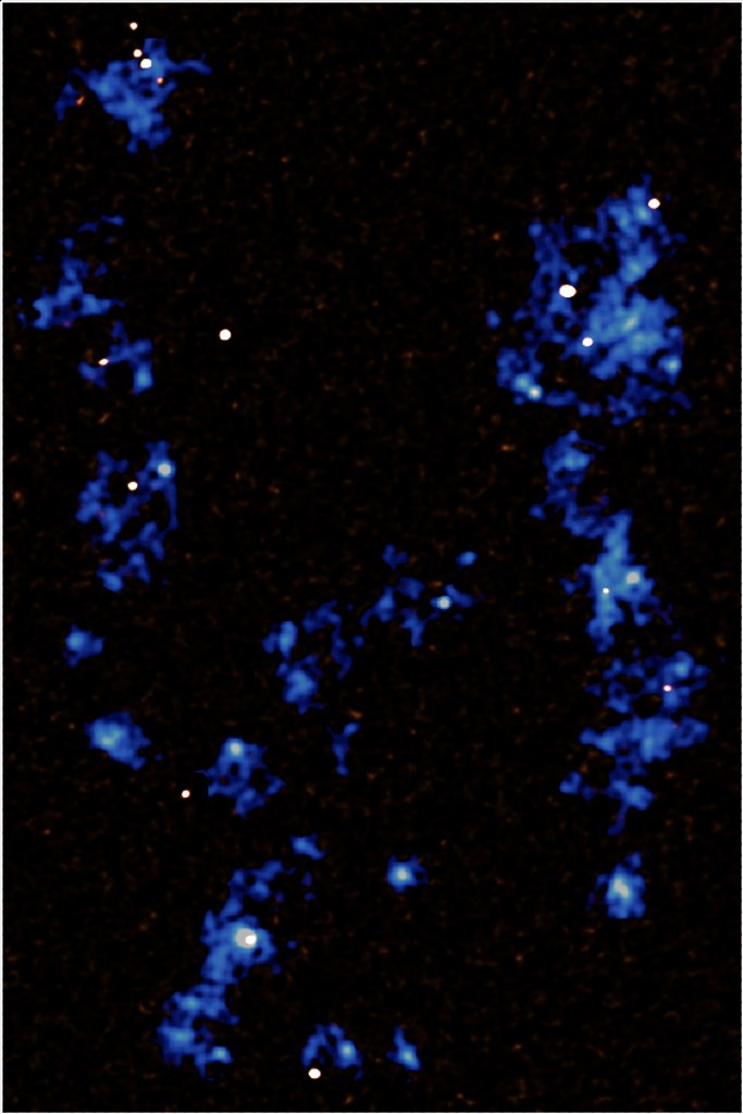Οι ερευνητές, με επικεφαλής τον αστρονόμο Χιντέκι Ουμεχάτα του Πανεπιστημίου του Τόκιο και του ερευνητικού κέντρου RIKEN, που έκαναν τη σχετική δημοσίευση στο περιοδικό «Science», εντόπισαν δύο τεράστια «πλοκάμια» του κοσμικού ιστού, αποτελούμενα από υδρογόνο, σε ένα γαλαξιακό σμήνος (SSA22) στον αστερισμό του Υδροχόου, σε απόσταση περίπου 12 δισεκατομμυρίων ετών φωτός από τη Γη.