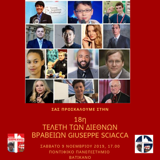 Στη λαμπρή τελετή της 18ης απονομής των Διεθνών Βραβείων και του Foundation Giuseppe Sciacca που θα λάβει χώρα το Σάββατο 9 Νοεμβρίου 2019, στις 17.30 στην αίθουσα τελετών του Πανεπιστημίου Pontificia Urbaniana στην πόλη του Βατικανό βραβεύονται άριστοι επιστήμονες και καλλιτέχνες, κυρίως νέοι, καθώς και εθελοντές που προσφέρουν στην ανθρωπότητα και στον πολιτισμό.
