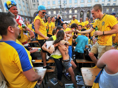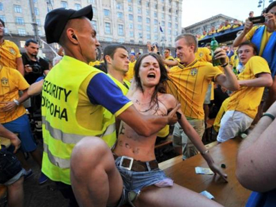 Μάλιστα μία υποστηρίκτριά της, που είχε βρεθεί στη fan zone των Σουηδών ημίγυμνη, σηκώνοντας πανό κατά της διοργάνωσης, απομακρύνθηκε… σηκωτή από τους υπευθύνους του Ολυμπιακού Σταδίου του Κιέβου.