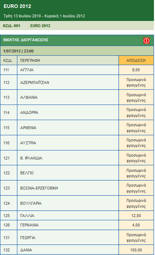 Τη μικρότερη απόδοση για την κατάκτηση του Euro 2012 έχει Ισπανία στο κουπόνι του «Πάμε Στοίχημα». Οι Ίβηρες θεωρούνται φαβορί για την κατάκτηση του τροπαίου και παίζονται με απόδοση 3,3.