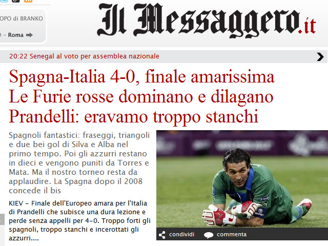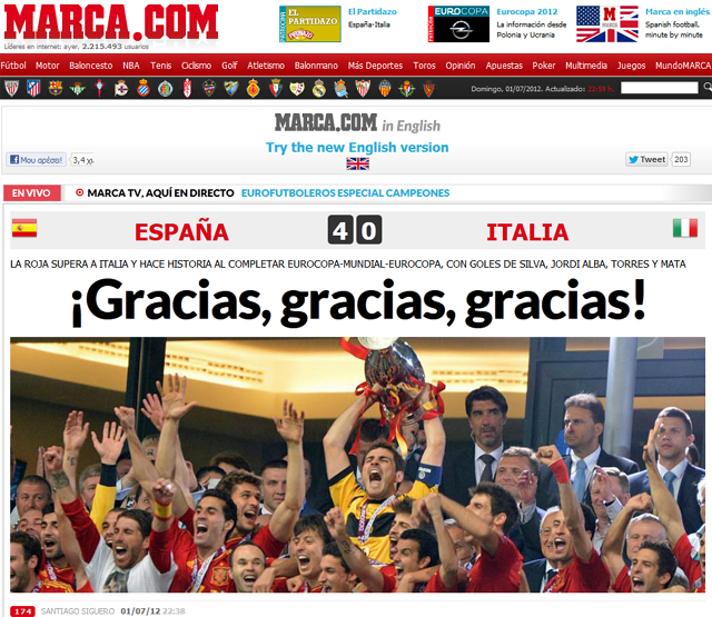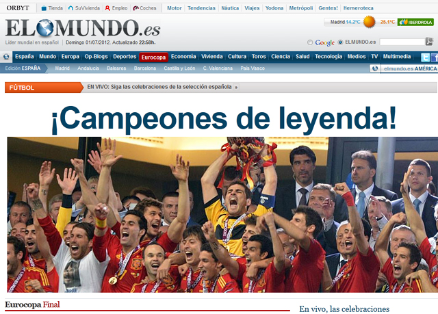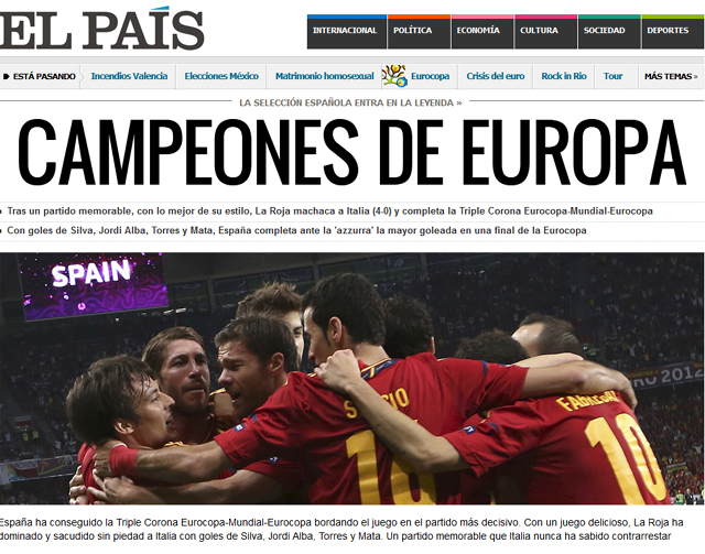Οι ισπανικές εφημερίδες αφιερώνουν εκτενή ρεπορτάζ και πανηγυρίζουν για την κατάκτηση του τροπαίου. El Mundo, Marca, El Pais αποθεώνουν τους πρωταθλητές Ευρώπης με τίτλους όπως «Ευχαριστούμε, ευχαριστούμε», «Θρυλικοί πρωταθλητές».