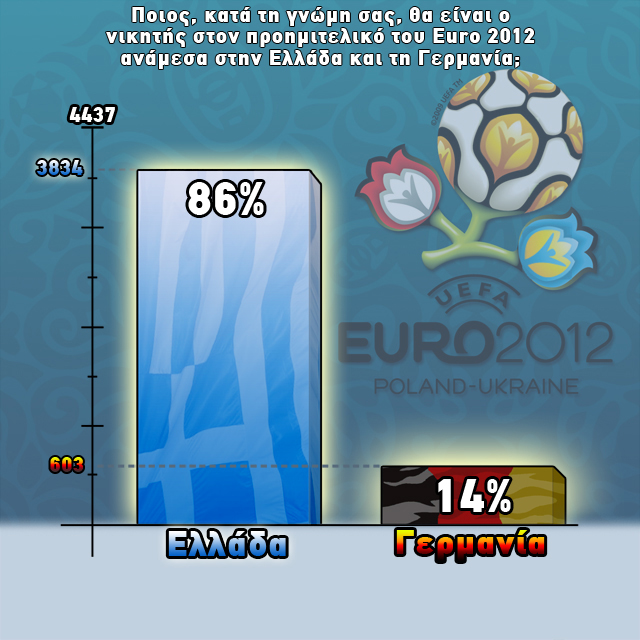 Από τους 4.437 που έλαβαν μέρος στη διαδικτυακή μας ψηφοφορία, η οποία διεξήχθη από τη Δευτέρα 18 Ιουνίου έως την Πέμπτη 21 Ιουνίου, το 86% (3.834) επέλεξε τη γαλανόλευκη ως νικήτρια, ενώ μόλις το 14% (603) ακολούθησε τη λογική και δήλωσε ότι η Γερμανία θα δικαιολογήσει την ανωτερότητά της και θα συνεχίσει να αγωνίζεται στα ημιτελικά του Euro 2012.