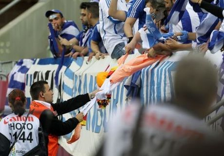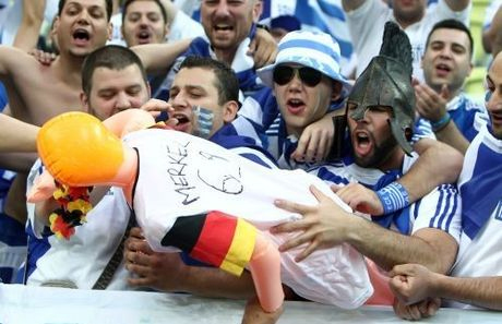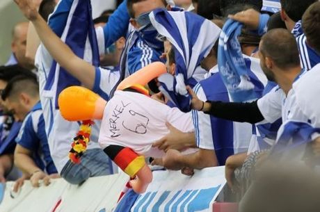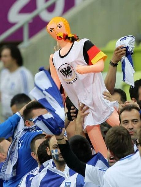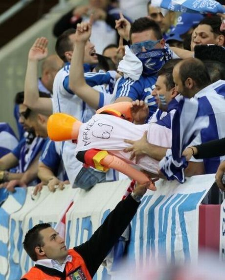 Ένταση προκλήθηκε στην εξέδρα των Ελλήνων φιλάθλων, λίγο πριν την έναρξη του προημιτελικού με την Γερμανία, για το Euro 2012. Οι Έλληνες φούσκωσαν μία ξανθιά κούκλα, η οποία είχε τη φανέλα της Γερμανίας και στην πλάτη το όνομα της Μέρκελ με τον αριθμό 69.