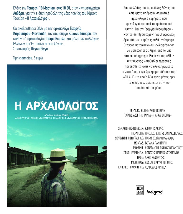 Ο βραβευμένος σκηνοθέτης Κίμων Τσακίρης (Sugartown-Οι γαμπροί, Sugartown-H επόμενη μέρα), επιστρέφει με την «Αρχαιολόγο» (17ο Φεστιβάλ Ντοκιμαντέρ Θεσσαλονίκης, Τμήμα «Πορτραίτα: Ανθρώπινες Διαδρομές»), μια ταινία τεκμηρίωσης γύρω από την προσπάθεια της αρχαιολόγου Γεωργίας Καραμήτρου-Μεντεσίδη να σώσει ό,τι μπορεί πριν χαθεί για πάντα στον βυθό μιας τεχνητής λίμνης στη Δυτική Μακεδονία.