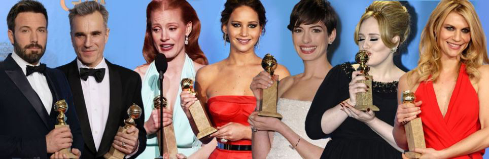 Η Τζέσικα Τσαστέιν (υποψήφια και για το Όσκαρ Ά γυναικείου ρόλου) βραβεύτηκε με την Χρυσή Σφαίρα καλύτερης δραματικής ερμηνείας για τον ρόλο της στο «Zero Dark Thirty» της Κάθριν Μπίγκελοου, το γουέστερν «Django» του Κουέντιν Ταραντίνο πήρε δύο βραβεία, αυτό του καλύτερου σεναρίου στον ίδιο τον Ταραντίνο (είναι υποψήφιος και για το αντίστοιχο Όσκαρ) και Β’ ανδρικής ερμηνείας στον, καταπληκτικό κατά την άποψη μου, Κρίστοφ Βαλτς (είναι υποψήφιος και για το αντίστοιχο Όσκαρ). Η «Ζωή του Πι» βραβεύθηκε για την μουσική του Μάικλ Ντάνα (υποψήφια ταινία και για το αντίστοιχο Όσκαρ), και το «Skyfall» του Σαμ Μέντες βραβεύτηκε, όπως ήταν αναμενόμενο, για το τραγούδι της Αντέλ. Από την άλλη πλευρά της όχθης το «Silver Linings Playbook – Οδηγός αισιοδοξίας», που προτάθηκε για 8 συνολικά Όσκαρ σε όλες τις σημαντικές κατηγορίες, απέσπασε μία Χρυσή Σφαίρα στην κατηγορία της καλύτερης γυναικείας ερμηνείας σε κωμωδία ή μιούζικαλ Τζένιφερ Λόρενς (υποψήφια και για Όσκαρ Α΄ γυναικείου ρόλου). Τέλος το «Amour» του Χάνεκε συνεχίζει την «σαρωτική» του πορεία καθώς του δόθηκε η Χρυσή Σφαίρα καλύτερης ξενόγλωσσης ταινίας.