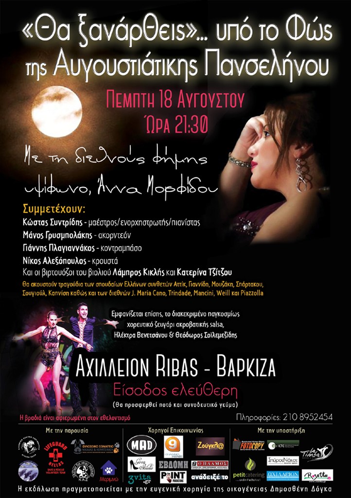 Μεγάλη συναυλία αφιερωμένη στον εθελοντισμό θα πραγματοποιηθεί υπό το φώς της μαγευτικής αυγουστιάτικης πανσελήνου στο χώρο του Αχίλλειον Ribas στη Βάρκιζα, την Πέμπτη 18 Αυγούστου στις 21:30.  Κάθε τραγούδι είναι μια ξεχωριστή ιστορία, ένα ταξίδι στο όνειρο… Είναι γέφυρα που ενώνει τις καρδιές, τις εποχές, τους χρόνους και τους τόπους κάτω από ένα ολόγιομο φεγγάρι.