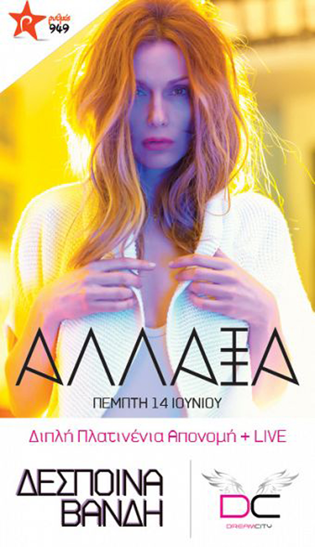 Η Δέσποινα Βανδή θέλει να γιορτάσει συντροφιά με τους θαυμαστές την πλατινένια απονομή του νέου της άλμπουμ «Άλλαξα» και για τον λόγο αυτό ετοιμάζει ένα ανατρεπτικό live στο Dream City (Βουτάδων 2 στο Γκάζι) την ερχόμενη Τετάρτη 20 Ιουνίου.