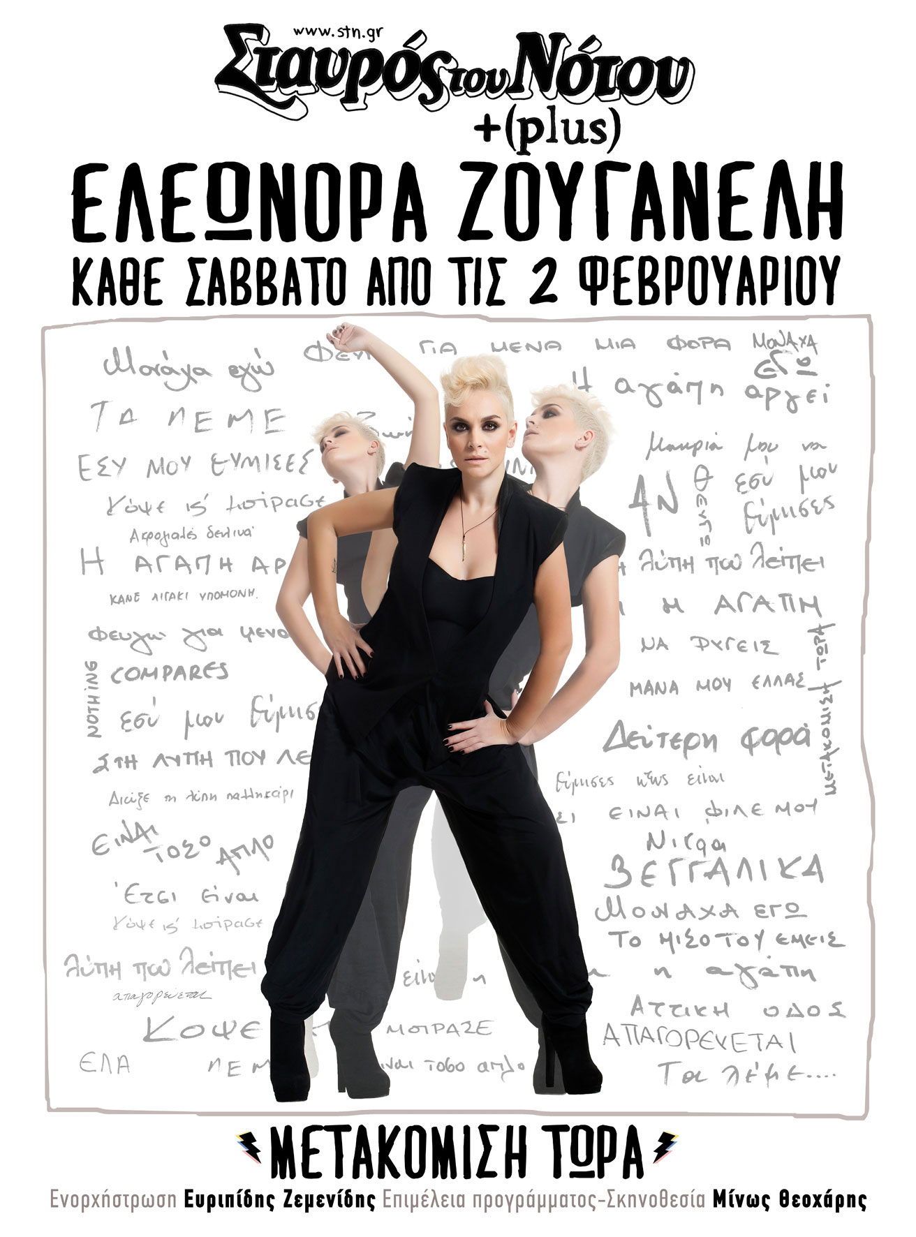 Με ένα ξεχωριστό πρόγραμμα, η Ελεωνόρα Ζουγανέλη ετοιμάζεται να υποδεχθεί από τις 2 Φεβρουαρίου και για κάθε Σάββατο τους φίλους της στον χώρο στον οποίο πρωτοξεκίνησε τις live εμφανίσεις της, στον Σταυρό του Νότου Plus, για να παρουσιάσει για πρώτη φορά στην Αθήνα δείγμα της καινούργιας της πολυαναμενόμενης δουλειάς, αλλά και τραγούδια γνωστά και αγαπημένα.