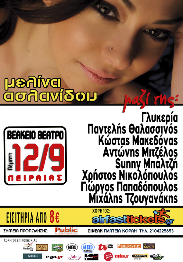 Με ένα «Καλοκαίρι Αγκαλιά…» χωρίς «Διεύθυνση» αλλά με δροσερές, ανανεωμένες και δυναμικές αποσκευές – τραγούδια, η Μελίνα Ασλανίδου έρχεται για να μαγέψει με την μοναδική φωνή της και τα υπέροχα τραγούδια της και να χαρίσει μια αξέχαστη βραδιά στο Βεάκειο θέατρο του Πειραιά, την Πέμπτη 12 Σεπτεμβρίου.