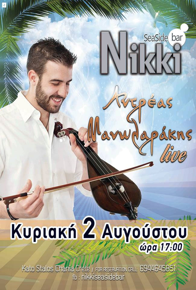 Πιο συγκεκριμένα την Κυριακή 2 Αυγούστου (ώρα έναρξης 17.00) στο δημοφιλές στέκι του Κάτω Σταλού ο Ανδρέας Μανωλαράκης και το συγκρότημα του θα διασκαδάσουν τους θαμώνες του Nikki seaside bar, σε ένα event, που αναμένεται να έχει πολύ κέφι, χορό, πάντα σε κρητικούς ρυθμούς.