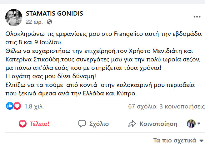 «Ολοκληρώνω τις εμφανίσεις μου στο Frangelico αυτή την εβδομάδα στις 8 και 9 Ιουλίου.