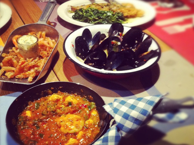 Ο Νίκος Φωτιάδης επιμελήθηκε τους θαλασσο-μεζέδες του καταλόγου, με σουβλάκια από τηγανητό χταπόδι καραμελωμένα κρεμμύδια και σάλτσα ξυδιού, σαγανάκια λεμονάτα και κοκκινιστά, καλαμαράκια σκορδάτα, μυδόσουπα και πολλές πολλές άλλες επιλογές. Βέβαια, παραμένει η φημισμένη κακαβιά αλλά και η σαλάτα Καστελόριζο.