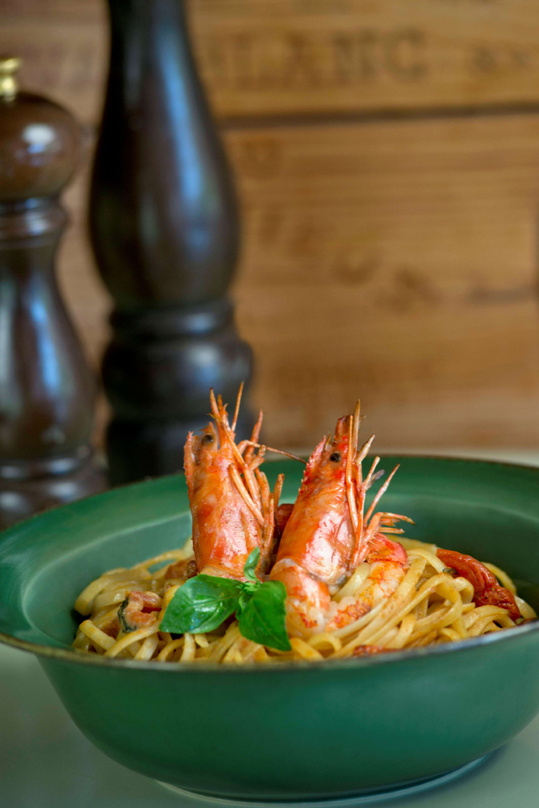 • SPAGHETTI CON GAMBERI E POMMODORI: Spaghetti με γαρίδες στη σάλτσα τους και ψητή τομάτα